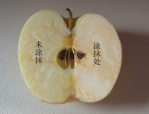 把涂抹了精華液的蘋果放在未見陽光的桌上4小時后,涂抹精華液的右面沒有氧化變黃,依然水分充足,滋潤新鮮,而未涂抹的左面就因為氧化二變得暗黃干澀。這就說明它的抗氧化性極強,對肌膚有很強的保護作用。