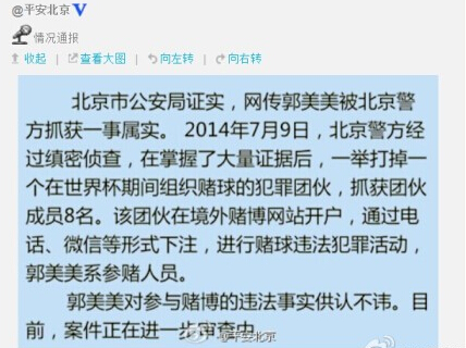 2014年7月10日,據(jù)法制晚報(bào)播報(bào):據(jù)線報(bào),郭美美因賭球被北京警方抓了!