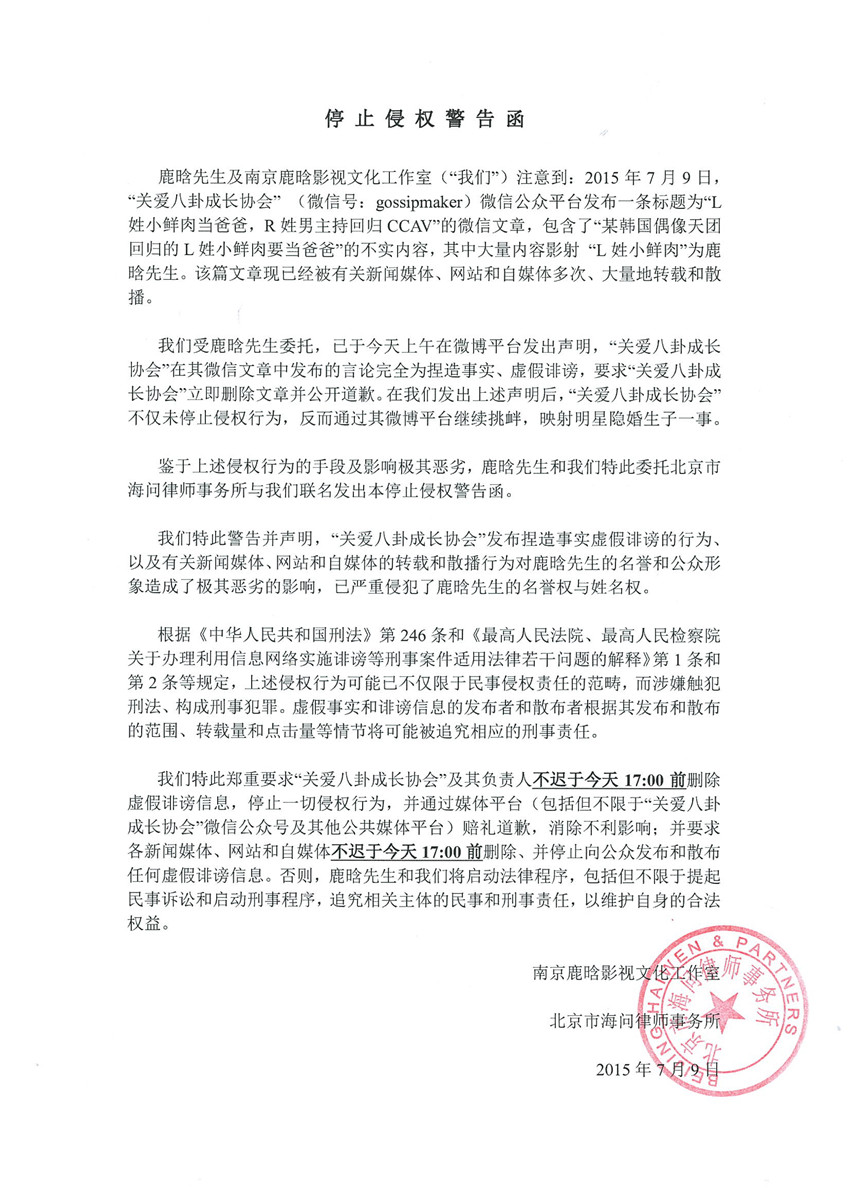 7月9日,關(guān)于“關(guān)愛八卦成長協(xié)會(huì)”微信公眾號(hào)發(fā)布“L姓小鮮肉當(dāng)爸爸”一文,影射鹿晗先生一事,鹿晗工作室發(fā)律師函否認(rèn)并警告其造謠生事,稱:“我們受鹿晗先生委托,已于今天上午在微博平臺(tái)發(fā)出聲明,“關(guān)愛八卦成長協(xié)會(huì)”在其微信文章中發(fā)布的言論完全為捏造誹謗,要求‘關(guān)愛八卦成長協(xié)會(huì)’立即刪除文章并公開道歉。在我們發(fā)出上述聲明后,‘關(guān)愛八卦成長協(xié)會(huì)’不僅未停止侵權(quán)行為,反而通過其微博平臺(tái)繼續(xù)挑釁,映射明星隱婚生子一事,鑒于行為惡劣,發(fā)出警告函?!?/p>