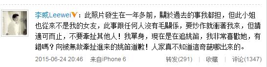 6月24日晚,李威發(fā)布微博回應“照片門”,表示“此照片發(fā)生在一年多前,關(guān)于過去的事我都擔,但此小姐也從來不是我的女友,此事跟任何人沒有毛關(guān)系,要炒作就沖著我來,但請適可而止,不要牽扯其他人!我單身,現(xiàn)在是在追姚笛,我非常喜歡她,有錯嗎?向被無故牽扯進來的姚笛道歉!人家真不知道這奇葩哪出來的?!?/font>