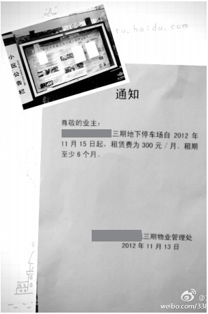 他稱將盡快對微博上的投訴進(jìn)行回復(fù),以消除通知帶來的影響和誤會,同時將收集業(yè)主意見,慎重考慮停車位費(fèi)用問題。