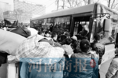 河南商報(bào)記者 鄧萬里/攝 不少返城農(nóng)民工下了長途車來擠公交車
