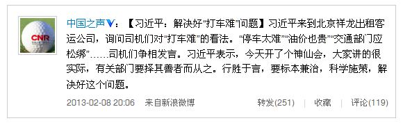 【習(xí)近平:解決好“打車難”問題】習(xí)近平來到北京祥龍出租客運(yùn)公司,詢問司機(jī)們對(duì)“打車難”的看法。“停車太難”“油價(jià)也貴”“交通部門應(yīng)松綁”……司機(jī)們爭相發(fā)言。習(xí)近平表示,今天開了個(gè)神仙會(huì),大家講的很實(shí)際,有關(guān)部門要擇其善者而從之。行勝于言,要標(biāo)本兼治,科學(xué)施策,解決好這個(gè)問題。