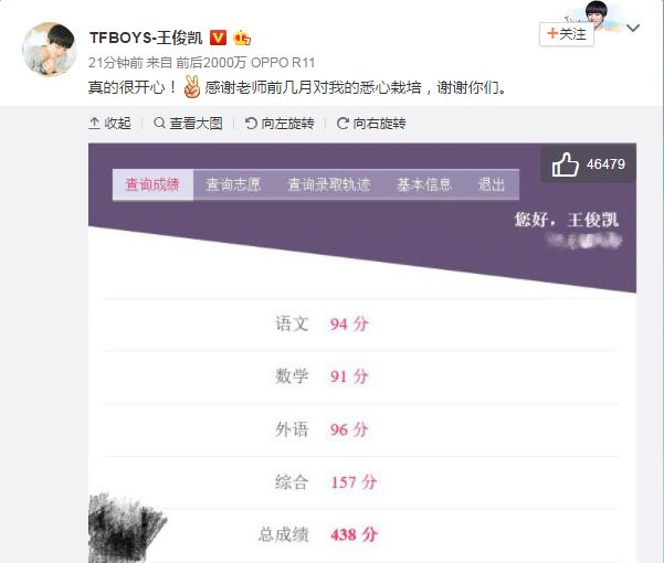 近幾日,2017年全國統(tǒng)一高考成績都陸續(xù)出爐,網(wǎng)友們非常關(guān)心的參加今年高考的TFboys王俊凱的成績今日也終于公布了!