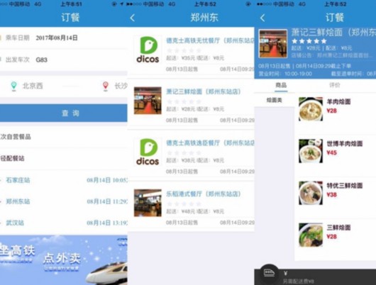 基于手機高鐵購票APP,消費者打開之后轉(zhuǎn)到商旅服務(wù)一欄找到訂餐服務(wù),在上面輸入乘車日期和車次之后就能選擇餐點,再填寫姓名和座位號等信息,付款成功之后就能“坐等”外賣送達手中。