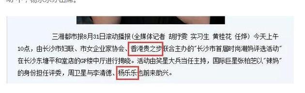 此外,另一篇來(lái)自三湘都市報(bào),題為《張柏芝當(dāng)評(píng)委現(xiàn)身長(zhǎng)沙至潮五星辣媽揭曉》的報(bào)道也提到,在長(zhǎng)沙市婦聯(lián)、市女企業(yè)家協(xié)會(huì)、香港貴之步聯(lián)合主辦的“長(zhǎng)沙市首屆時(shí)尚潮媽評(píng)選活動(dòng)”中,楊樂(lè)樂(lè)亦出席。