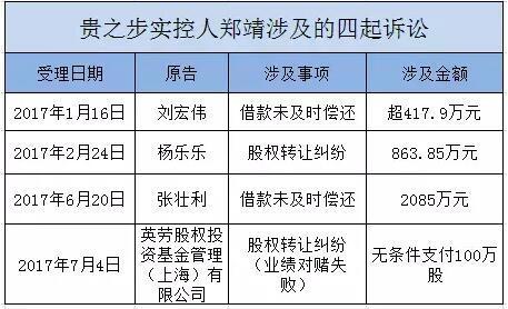 因涉及多起訴訟,鄭靖所持貴之步2347.45萬(wàn)股(占公司股份總數(shù)73.39%)被多家法院凍結(jié)。