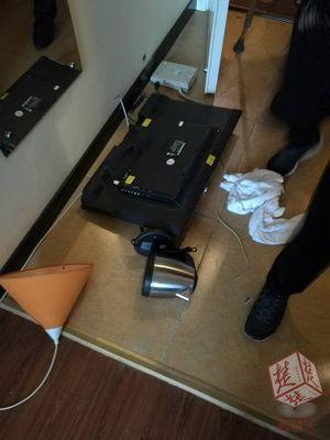 無奈,酒店工作人員只好用樓層房卡將6038號房打開。打開門,眾人驚呆了!一個沒穿上衣的小伙子正在玩手機,房內(nèi)的電話機、電水壺、臺燈、電視機都被砸了,甚至連床板都拆了……