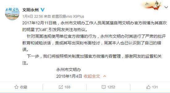 湖南省永州市文明辦官方微博:2017年12月11日晚,永州市文明辦工作人員周某擅自用文明辦官方微博為其喜歡的明星“打call”,引發(fā)網(wǎng)友關(guān)注與熱議。針對周某違規(guī)使用單位官方微博的行為,永州市文明辦對其進(jìn)行了嚴(yán)肅的批評教育和誡勉談話,責(zé)成其寫出深刻書面檢討,周某本人也已認(rèn)識到了自己的錯誤。