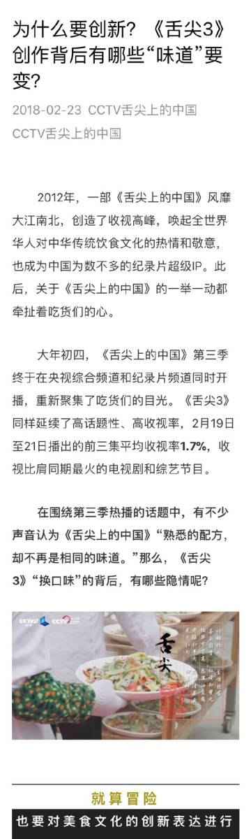 《舌尖上的中國(guó)》官方轉(zhuǎn)發(fā)某媒體長(zhǎng)文回應(yīng)第三季質(zhì)量不佳的質(zhì)疑:就算冒險(xiǎn),也要對(duì)美食文化的創(chuàng)新表達(dá)進(jìn)行探索。