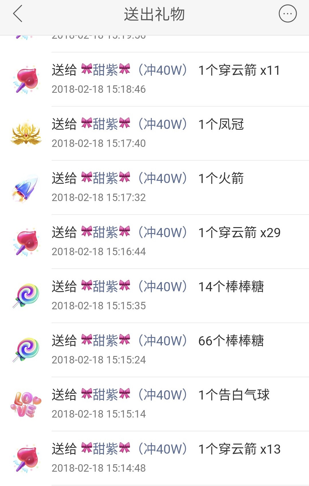 小薇出手闊綽,還經(jīng)常將同樣的禮物一次連刷好幾個,打賞記錄顯示,最多時她一次連刷29個“穿云箭”送給“甜紫”,折合人民幣8375.2元。