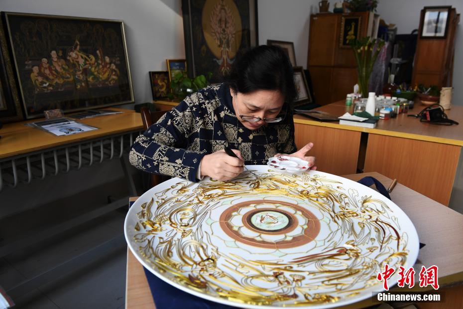 4月7日,蘭州文理學(xué)院女教師白茜用金屬絲在瓷盤(pán)上創(chuàng)作掐絲琺瑯畫(huà)。中新社記者 楊艷敏 攝