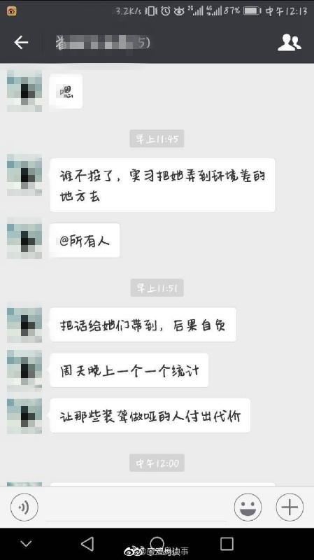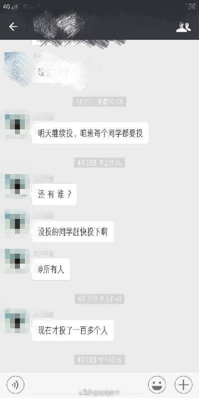 該網友提供的聊天截圖顯示,一個昵稱叫“大江東去”的人4月21日在班級微信群中說“明天繼續(xù)投,咱班每個同學都要投”“沒投的同學趕快投下”“現(xiàn)在才投了一百多個人”。在另一個名叫“首腦交流群”的微信群中,“大江東去”對班干部說:“誰不投了,實習把她弄到環(huán)境差的地方去”“把話給她們帶到,后果自負”“周天晚上一個一個統(tǒng)計”“讓那些裝聾作啞的人付出代價”。