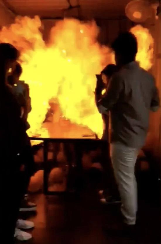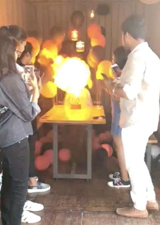 視頻剛開始的畫面是女孩準備點燃生日蛋糕上的蠟燭,她的朋友們紛紛簇擁上來,用手機拍照,想要為她記錄這幸福的一刻。畫面中,女孩身穿一件灰藍色連衣裙,左臂內(nèi)側(cè)紋著一枚與眾不同的紋身圖案,四周被數(shù)十個粉色以及黑色的氫氣球圍繞著,接下來她劃了一根火柴,點燃了生日蛋糕上的蠟燭準備許愿,緊接著,附近的氫氣球就突然發(fā)生了爆炸。房間里瞬間升起了巨大的火球,女孩也被火焰圍繞,她和朋友們都嚇得尖叫了起來。