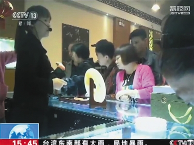 6月15日,央視“新聞直播間”節(jié)目中,游客在珠寶飾品店內(nèi)選購(gòu)商品。視頻截圖