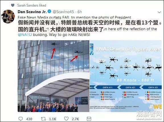 但是,白宮社群媒體主任史卡比諾 (Dan Scavino Jr。)卻站出來指責(zé)“假新聞”。他表示,當(dāng)時各國領(lǐng)導(dǎo)人正在抬頭看天空中飛過的13國直升機,并配上了一張動作整齊劃一的照片。
