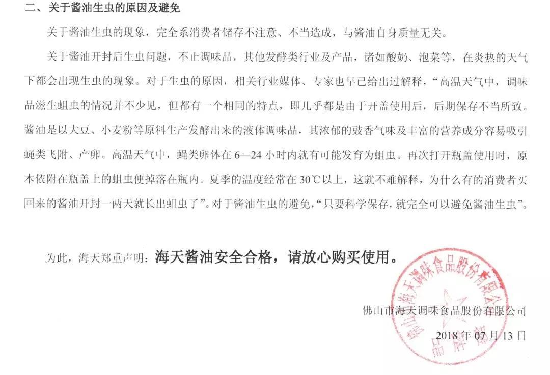 7月13日,海天味業(yè)在其官網(wǎng)發(fā)布“海天醬油安全合格,請放心購買使用”聲明。聲明稱,海天味業(yè)出場的產(chǎn)品均按照國家標準生產(chǎn),在出廠前均經(jīng)過檢驗合格。因此,未開封的產(chǎn)品不會有活蟲和蟲卵生長。至于醬油開封后出現(xiàn)蛆蟲,海天味業(yè)解釋說,不止調味品,酸奶、泡菜等發(fā)酵產(chǎn)品在炎熱的條件下也容易生蟲。而醬油生蛆“完全是消費者儲存不當造成,與醬油自身質量無關”。