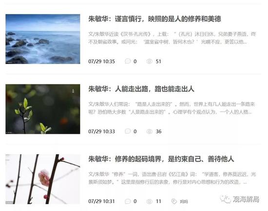 這些文章以游記、散文、人生感悟?yàn)橹?,也有一部分詩歌。其中,最新的一篇為《聞過則喜 折射的是胸襟格局和修養(yǎng)境界》,發(fā)表于8月13日,也就是本周一。