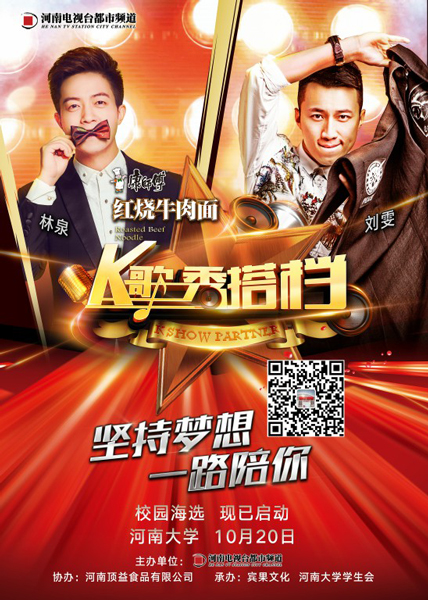 10月20日,由都市頻道和康師傅紅燒牛肉面聯(lián)合推出的《名嘴K歌秀》校園海選活動將在河南大學(xué)啟動并進行首場選拔,在接下來的兩個月時間里,該活動將走進省內(nèi)六大高校,尋找最會唱歌的你。