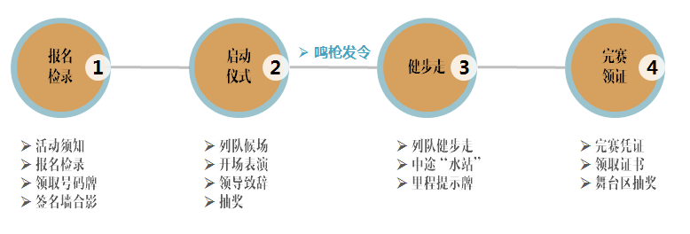 現(xiàn)場流程:報名檢錄——啟動儀式——健步走——完賽證書