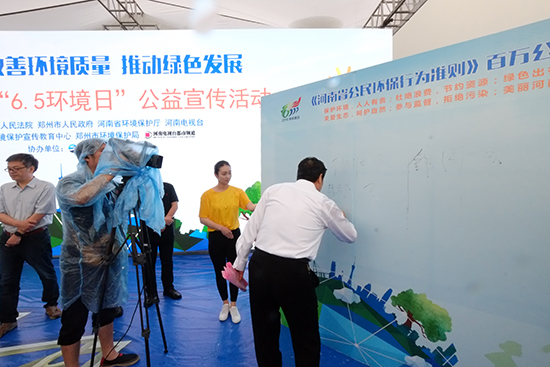 十一位領(lǐng)導(dǎo)共同啟動了“《河南省公民環(huán)保行為準則》百萬公民電子簽名墻”正式上線儀式,并在《河南省公民環(huán)保行為準則》百萬公民簽名墻上,簽下自己的名字,成為首批在“百萬公民簽名墻”上簽字的環(huán)保志愿者!