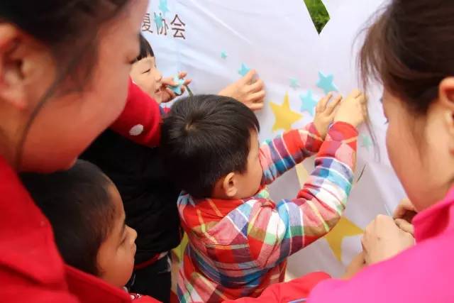 志愿者代表和星兒代表把制作好的小星星粘貼到我們的星星兒童村發(fā)展藍(lán)圖上。