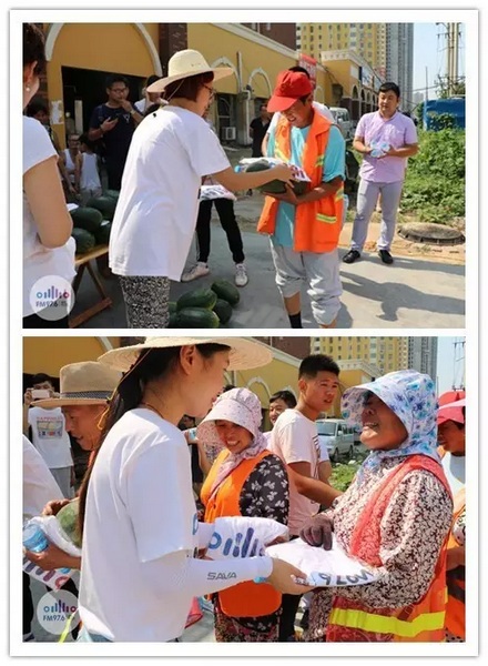 我們給他們每人都送了一個西瓜,遞到他們手里跟他們說:“你們辛苦了!”的時候,我們明顯能夠感覺到他們的喜悅,他們飽經(jīng)風(fēng)霜的臉上洋溢的笑容,讓人覺得特別溫馨、真誠。