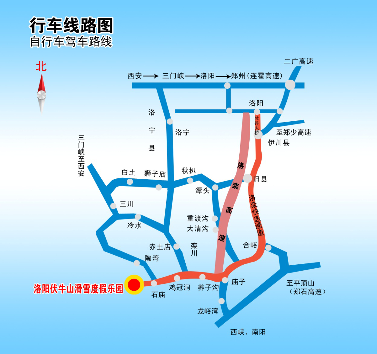 洛陽-嵩縣-欒川縣城-欒川石廟鎮(zhèn)-滑雪場(140公里)。2、鄭州-新密-登封-伊川-嵩縣-欒川縣城-欒川石廟-滑雪場(260公里)。
