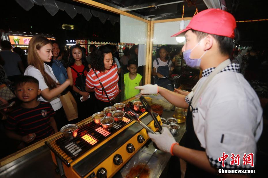 9月17日,顧客排隊(duì)在購(gòu)買“烤腦花”。在掌握了技能后于6月初回到家鄉(xiāng)河南漯河市文化路夜市開起了漯河首家“不靠譜烤腦花”。