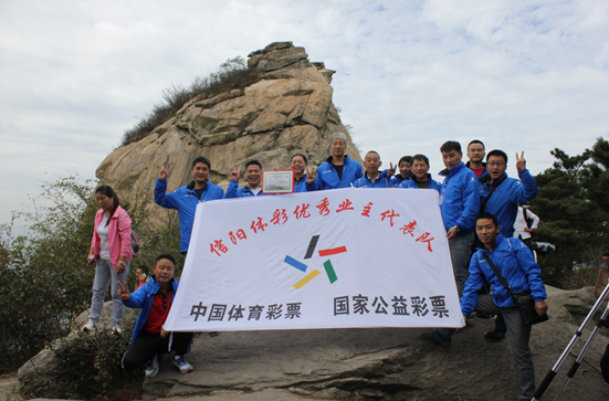 在五公里蜿蜒曲折的登山步道上,信陽體彩代表隊各成員互幫互助,你拉我一把,我扶你一步,“責任 誠信 團結 創(chuàng)新”的體彩精神在這一刻得到了最好的體現(xiàn)。在山頂報曉峰廣場,大家不知疲倦為群眾介紹體彩玩法,成為了一個個流動的宣傳站。