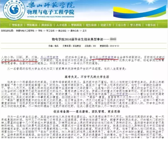 樂山師院學院官網(wǎng)上貼出的關(guān)于李飛創(chuàng)業(yè)的典型事跡