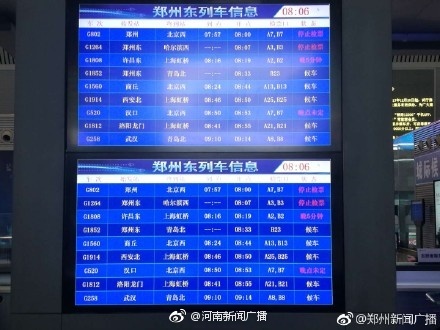 【暴雪導(dǎo)致部分列車停運】1月4日,記者從鄭州東站了解到,受冰雪影響,途徑鄭州東站的14趟列車停運,具體車次如下(以下列車均為往返車次):