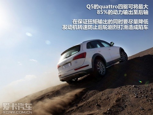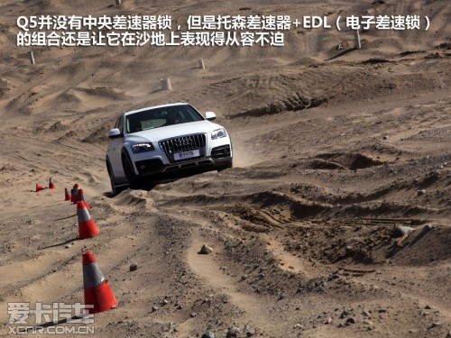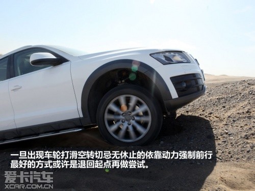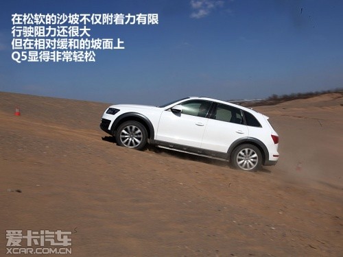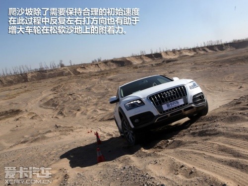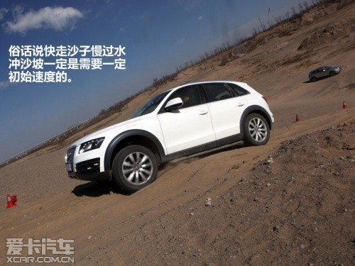 沙坡前半部分的坡度相對要緩一些,而奧迪Q5通過這里的過程自然也是毫不費力。那么在接下來更陡的后半部分當中,坡度的增大導致了車速急劇下降,此時松軟的沙子也就成為了車輛繼續(xù)攀爬的絆腳石,恰恰也就在此刻,檢驗quattro四驅系統真正能耐的時候隨之而來。