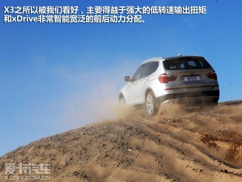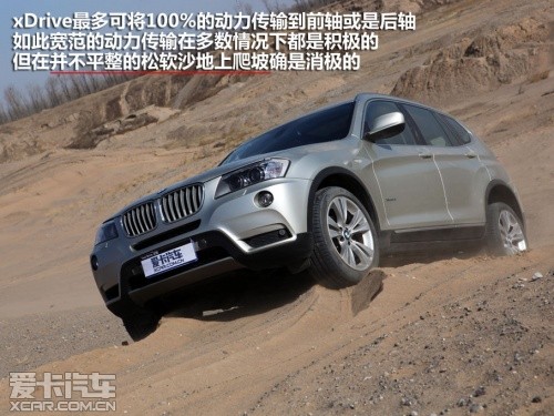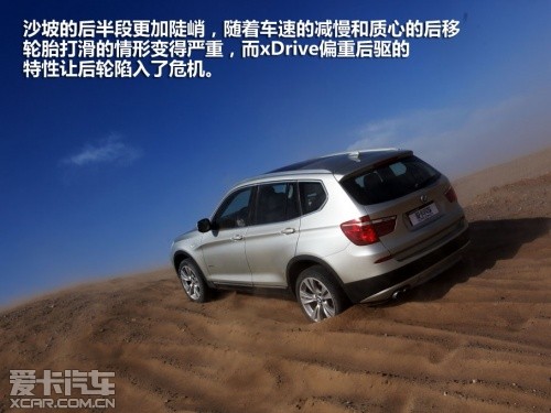 搭載3.0T發(fā)動機的寶馬X3,很顯然比Q5更為“肌肉”,但面對松軟的沙坡它也清楚的知道:光有腿部力量是遠遠不夠的,還必須要結合上肢力量才有可能登頂,此刻,xDrive系統起到了決定性的作用。