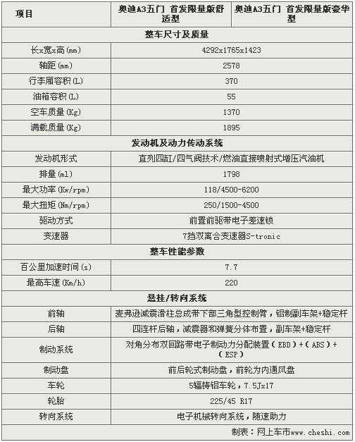 奧迪A3作為奧迪即將引入國(guó)內(nèi)的入門級(jí)車型,將于下個(gè)月正式上市發(fā)布。奧迪A3先期將首推兩款搭載1.8TFSI的五門版車型,分別為奧迪A3五門首發(fā)限量版舒適型和首發(fā)限量版豪華型。通過以下的官方參數(shù)和配置曝光,讓我們提起一睹奧迪A3到底具備怎樣的性能。