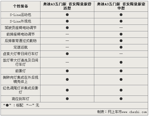 奧迪A3五門首發(fā)限量版舒適型和首發(fā)限量版豪華型基于配置的不同,將決定售價(jià)上的差異。奧迪A3五門首發(fā)限量版舒適型作為入門車型,取消了副駕駛座椅電動(dòng)調(diào)節(jié)、定速巡航以及氙燈帶大燈清洗等配置。