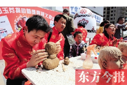 4月13日,在鄭州市秦嶺路一廣場,幾位民間藝人發(fā)起為腦癱患兒小晨陽募捐的義賣活動,造型各異的面人、神氣活現(xiàn)的泥塑、精致逼真的葫蘆烙畫……這些久違的民間藝術品受到市民熱捧,一個小時募捐了3667元。