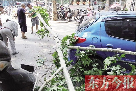原來,當(dāng)天下午1點(diǎn)25分,張先生和朋友一起吃飯,將自己的標(biāo)致207轎車停在了鄭州市靠近文化路的緯一路上,不料,幾分鐘后,一根長約六米的樹枝從天而降,將他的車后窗玻璃砸爛,車身也被砸凹了。