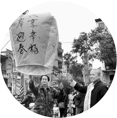近日,臺(tái)灣毫芒雕刻家陳逢顯(右)與傳統(tǒng)天燈工藝大師林國(guó)和(左)一起放飛寫(xiě)有“兩岸迎春· 共享幸?!钡奶鞜?。新北市平溪區(qū)放天燈久負(fù)盛名,已有百余年歷史。 王東明攝