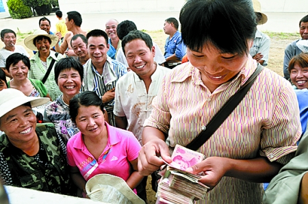 6月26日,在省糧油對外貿易有限公司郾城糧食儲備庫,前來賣糧的農民高興地數著手中的鈔票。