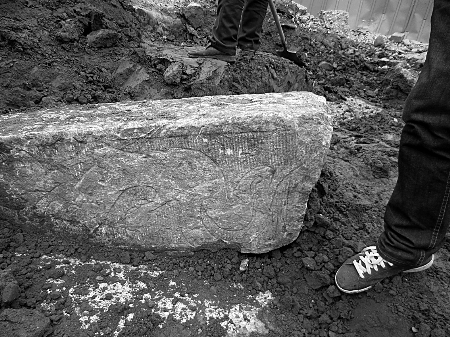 昨日上午,記者來到發(fā)現(xiàn)古墓的施工現(xiàn)場,南陽市文物考古研究所考古人員已經(jīng)進駐該工地,著手發(fā)掘工作。這座古墓位于該市臥龍路與車站路交叉口南側(cè)約700米處,4塊大小不一、形狀各異的大青石散落在工地中央,其中兩塊仍半掩在泥土中,依稀能看到上面刻有圖案(如圖),現(xiàn)場還有不少灰色磚塊。