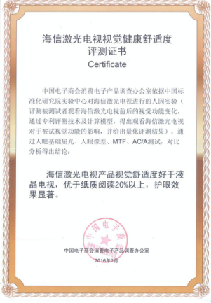 日前,中國標(biāo)準(zhǔn)化研究院還專門針對(duì)海信激光電視進(jìn)行了視覺舒適度的專項(xiàng)評(píng)測,通過專利評(píng)測技術(shù)及計(jì)算模型,分析人眼在不同疲勞狀態(tài)下視覺功能參數(shù)的變化情況,最終計(jì)算出觀看海信激光電視的視覺舒適度結(jié)果。檢測數(shù)據(jù)顯示:海信激光電視視覺呈現(xiàn)效果優(yōu)異,色覺呈現(xiàn)精準(zhǔn),畫面清晰度高,視覺刺激較小,是具有良好視覺舒適性的顯示產(chǎn)品。海信激光電視的視覺舒適度不僅優(yōu)于液晶電視,還優(yōu)于紙質(zhì)閱讀20%以上,護(hù)眼效果顯著。