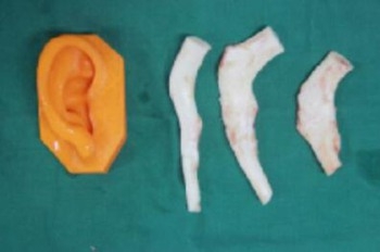 一期擴張順利,1月5日進行的是二期取肋軟骨再造耳廓的手術(shù)。術(shù)中引入3D打印輔助技術(shù),吳主任根據(jù)3D技術(shù)打印出來的耳廓模型進行精細雕刻,雕刻的耳廓外形美觀、逼真,將成形的耳廓植入擴張的皮膚內(nèi),術(shù)后效果良好。