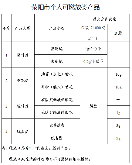 全市禁放區(qū)域以外的其他區(qū)域,除《煙花爆竹安全與質(zhì)量》(GB10631—2013)規(guī)定的1000響以下的C級爆竹和D級煙花外的其他等級、種類的煙花爆竹一律禁止燃放。