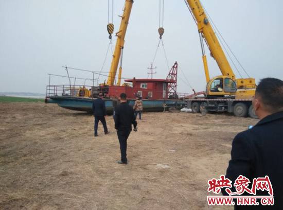 3月1日,執(zhí)法人員又來到汜水鎮(zhèn)趙村沙場岸邊,對一艘重達50噸的非法采砂船進行起吊離上岸。