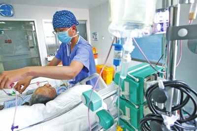 河南省人民醫(yī)院重癥監(jiān)護室內(nèi),“護士先生”王光昆守護在一位危重病人的床前。