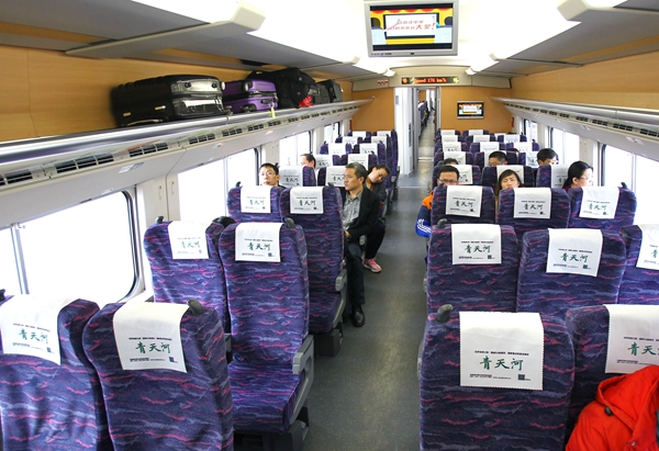 12點02分,記者在鄭州站乘坐C2967次列車再次體驗,發(fā)現(xiàn)車上的人數(shù)仍舊不多,多節(jié)車廂內(nèi)只有十幾個人,而2號車廂竟然空無一人。17點31分,記者乘坐C2972返程時,車上的人數(shù)則相對較多,多數(shù)車廂有將近30人,最多的一節(jié)有近40人。