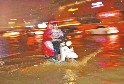昨晚11時30分許,經三路上兩個女孩騎著電動車走在“汪洋”中。