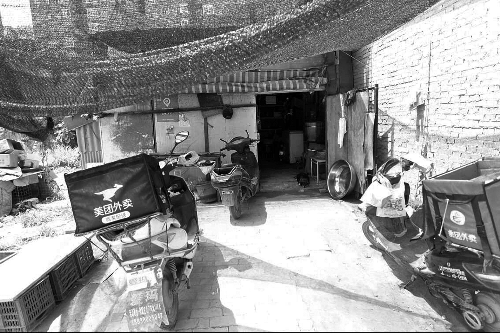 鄭先生所說(shuō)的作坊,位于某高校東門(mén)對(duì)面不遠(yuǎn)處的一座廢墟旁。如果不是在中午時(shí)分,店內(nèi)不斷傳出鍋勺碰撞的聲音和門(mén)口停著的幾輛后置送餐箱的電動(dòng)車,很難注意到這個(gè)僅有10多平方米大小、由破舊的門(mén)板搭成的小屋是一家“飯店”。