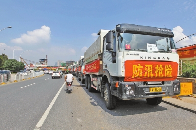昨天,武漢市江漢區(qū)沿江大道,一排排渣土車滿載渣土,停靠在路邊。長江北岸的堤壩上,到處張貼著“人在堤在”、“誓死保衛(wèi)大武漢”等宣傳標語。
